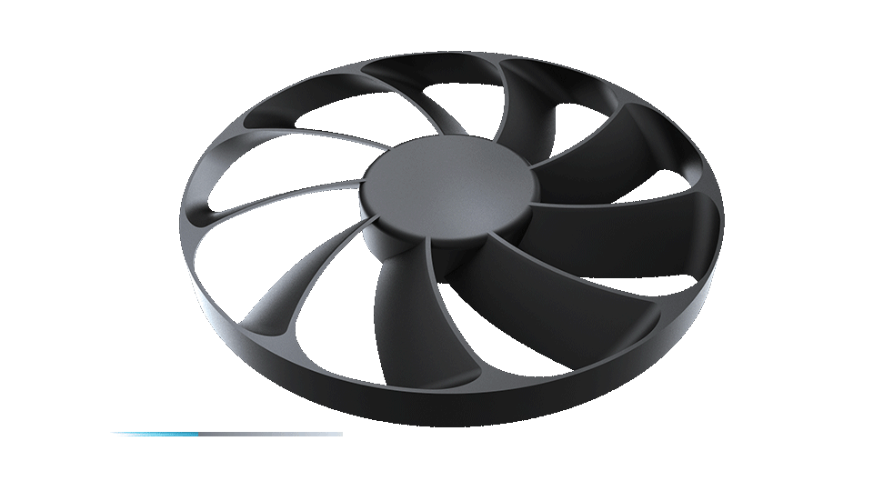 Duas ventoinhas Axial-tech dispõe de um centro da ventoinha mais pequeno para permitir pás mais longas e um anel que aumenta a pressão de ar descendente.